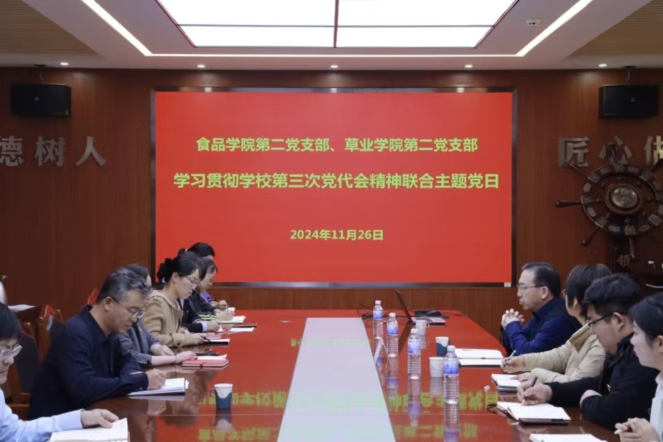 11月26日,太阳集团城娱8722第二党支部与草业学院第二党支部联合开展“学习贯彻太阳集团网站8722第三次党代会精神”主题党日活动,太阳集团网站8722党委副书记、校长赵金山参加联合主题党日活动,并为两个支部党员讲授学习贯彻学校第三次党代会精神专题党课,活动由学院第二党支部书记郭丽萍主持,食品学院、草业学院党委班子成员、食品学院各党支部支委成员参加活动。
