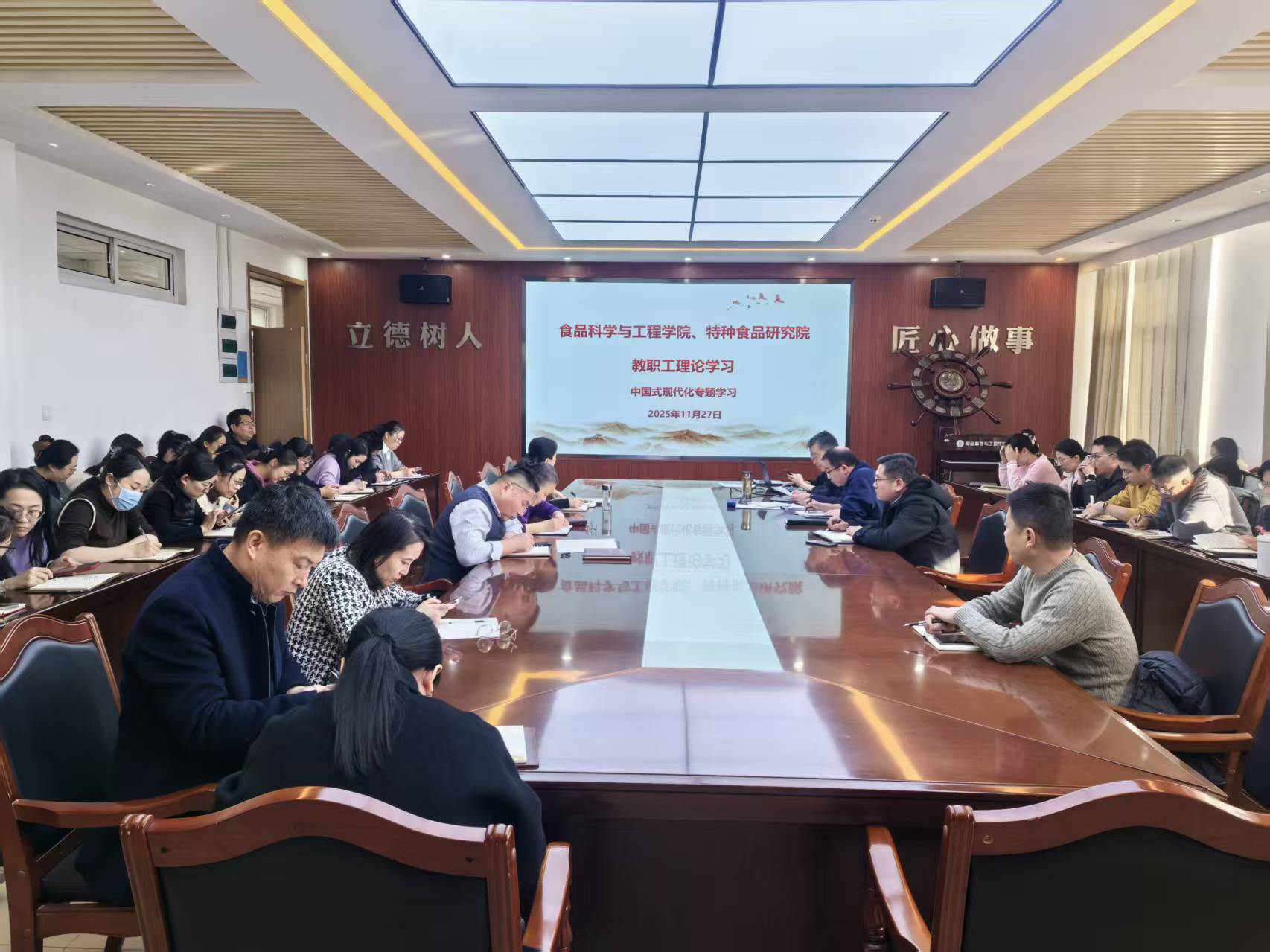 11月27日,太阳集团城娱8722、特种食品研究院召开全体教职工理论学习会议,围绕中国式现代化进行专题学习,会议由学院党委书记车广杰主持,全体教职工参加。