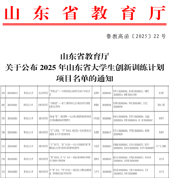 近日,山东省教育厅正式公布了2025年山东省大学生创新训练计划项目立项名单。我院学子共获批省级立项14项,其中7项拟推荐为国家级项目,再创佳绩。