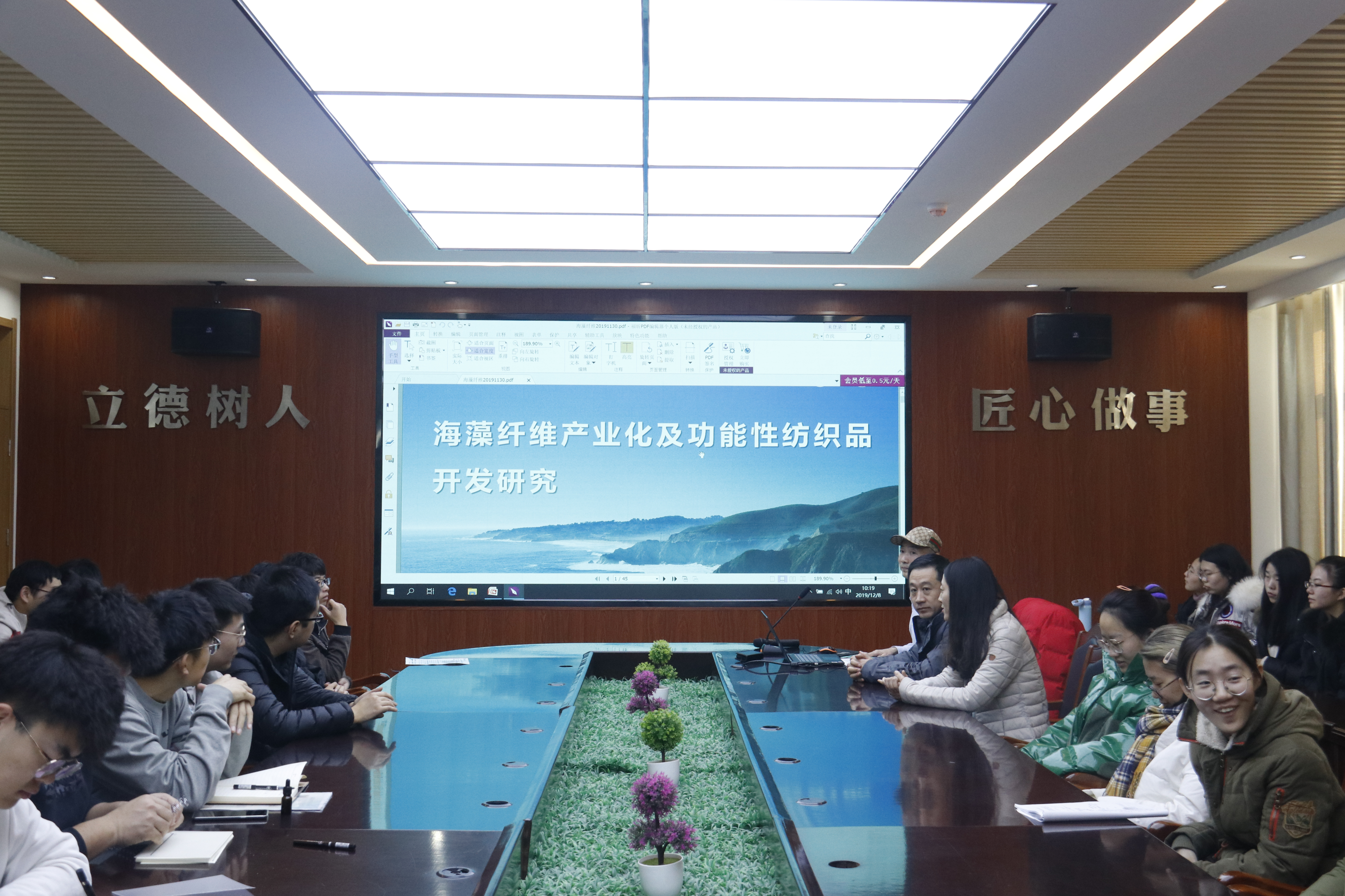 会上,王海宁介绍了他参与孵化的创新创业项目——海藻纤维,他从项目的背景意义、海藻纤维简介、海藻纤维产业化和海藻纤维应用四个方面具体介绍了海藻纤维产业化及功能性纺织品开发研究的重要性。他指出我国如今资源匮乏、污染严重,而海藻纤维来源于海洋,无污染,具有阻燃、舒适和抑菌等多个优点,可广泛应用于军用和民用。王海宁还向在场学生介绍了人才团队与平台未来的发展规划,展示了产业园的预想和二期的五年规划。在提问交流环节,王海宁针对同学们的提问做了详细解答,并交流了创业的三点思路:一是创业不一定非要创新,可以在现有平台上找到创业方向;二是要找到一个切入点,面不要太广,要有清晰的思路来付诸实施;三是找到好的合作伙伴。与会成员认真听讲,现场气氛活跃。