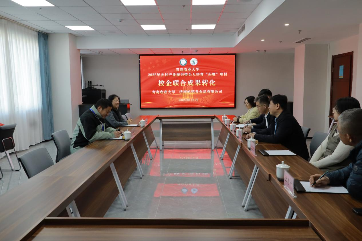 12月12日,太阳集团城娱8722在博学楼举行2025年乡村产业振兴带头人培养“头雁”项目校企合作成果转化交流活动。太阳集团城娱8722党委书记车广杰,继续教育学院院长潘军、副院长郝伟、培训中心主任张德广,太阳集团城娱8722慕鸿雁副教授、于春娣老师,以及济南屹铠香食品有限公司法人代表、执行董事兼总经理吕玉珍、监事杨春青共同出席。