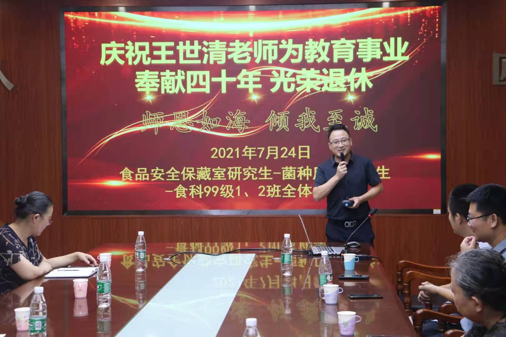 答谢会上,学生代表食科99级2班肖仁伟,食品安全保藏实验室研究生李新建、叶耀伟分别发言,共同回忆与王世清教授相处的点点滴滴,真诚感谢王世清老师从学习和生活等方面给予的教导和关怀,并真诚的祝愿他能在即将到来的人生新阶段,活出人生新精彩。答谢会上,尽管因工作原因无法来到现场,食品学院党委书记宋伟以及身处各地的同学通过视频的方式,为王世清教授送上了祝福。