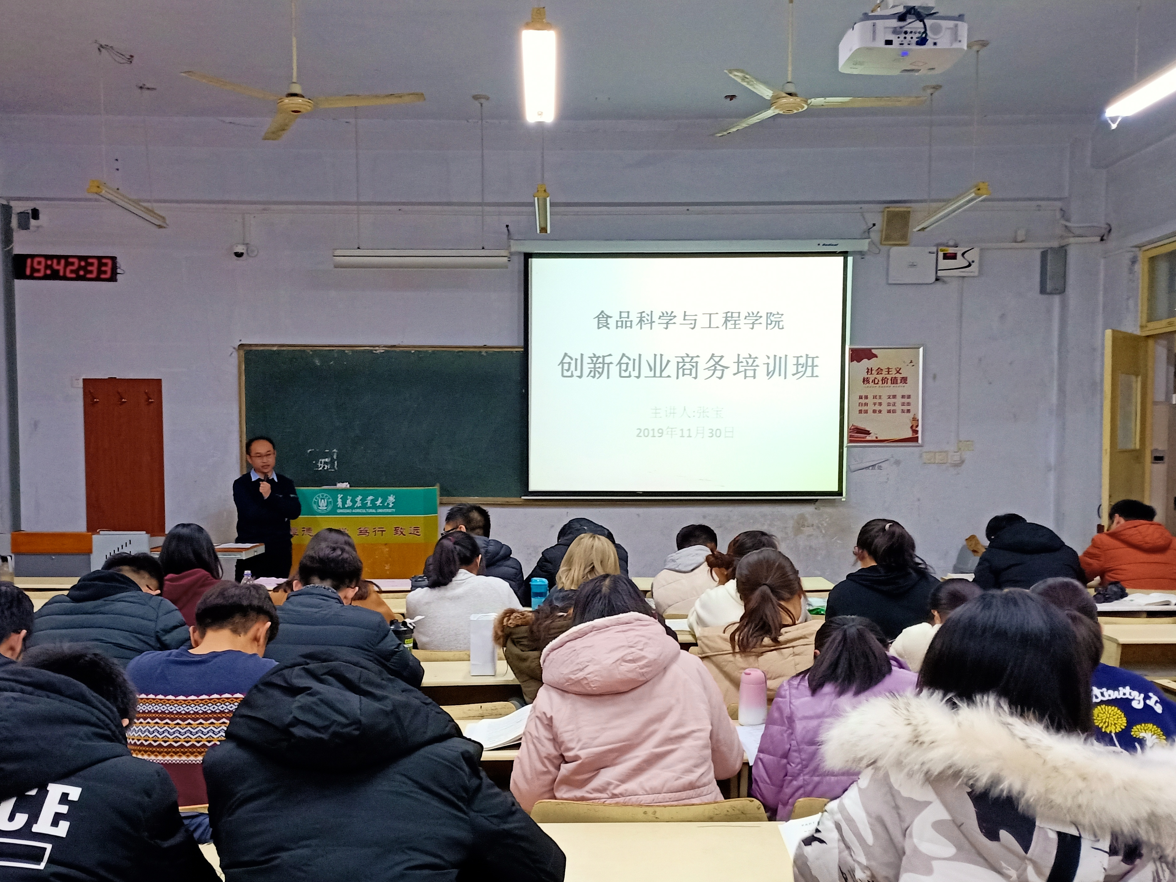 培训会上,张宝从大学生就业出发,围绕创业目的、创业途径、创业意义展开讲解。他指出,当下大学生的创新创业,一方面关于个人,需合理规划未来,对目标坚持不懈,广泛积累知识和人脉;另一方面关于社会,需紧跟国家的政策,合理选择一些朝阳企业。随后,张宝结合自己的亲身经历与经验,分析了当下社会的创业形势,并指出当代大学生的最大财富便是充满激情与活力的青春,希望大家努力奋斗,不负韶华。他还提出五点建议:一要永远学习;二要合理规划;三要积攒人脉和资源;四要控制自己的情绪;五要增大视野和格局。与会学生认真听讲,现场气氛活跃。