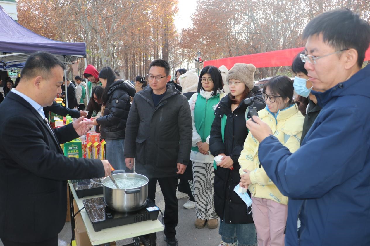 活动现场,山楂、金银花、鹿系列制品,以及糁、煎饼、粘豆包等数十种临沂特色农产品整齐陈列,琳琅满目。挂职干部们向师生详细介绍产品的产地特色、制作工艺与品质优势,热情邀请大家品鉴体验。师生们纷纷驻足品尝,赞不绝口,对沂蒙历史文化有了更深入的了解。