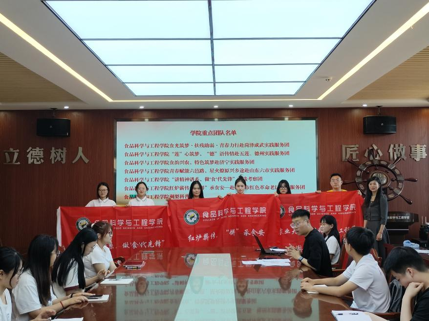仪式上,李曼为各实践团队授旗。今年暑期食品学院共遴选组建了20余支社会实践团队,其中包括校级重点调研团队1支、院级重点实践专项团队7支,参与社会实践总人数共计200余人。另有40余名同学经过“青鸟计划”等暑期实践项目选拔,进入到家乡的机关、企事业单位实习,感知山东、提高认识和融入社会的素质能力。