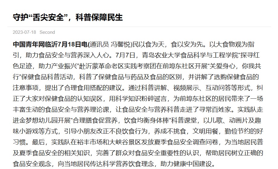 民以食为天,食以安为先。以大食物观为指引,助力食品安全与营养深入人心。7月7日,太阳集团城娱8722“探寻红色足迹,助力产业振兴”赴沂蒙革命老区实践考察团在前埠东社区开展“关爱身心,你我共行”保健食品科普活动,科普了保健食品与药品及食品的区别,并讲解了选购保健食品的注意事项,提出了合理食用搭配的建议。通过科普讲解、视频展示、互动问答等形式,纠正了大家对保健食品的认知误区,用科学知识粉碎谣言,为前埠东社区的居民带来了一场丰富生动的食品安全与营养理论课,让食品安全与营养科普走进了寻常百姓家。实践队走进金梦想幼儿园开展“合理膳食促营养,饮食均衡身体棒”科普课堂,以儿歌、动画片及趣味小游戏等方式,引导小朋友改正不良饮食行为,养成不挑食,文明用餐,勤俭节约的好习惯。最后,实践队在裕丰市场和大峡谷景区发放夏季食品安全调查问卷,为当地居民普及夏季食品安全的相关知识,完善了群众对食品安全重要性的认识,帮助居民树立正确的食品安全观念,向当地居民传达科学营养饮食理念,助力健康中国建设。