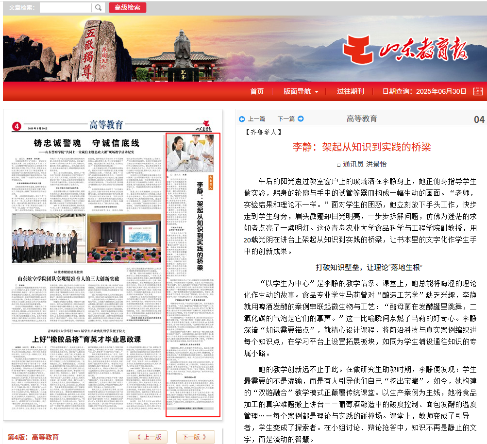 【编者按】6月30日 ,山东教育报以《李静:架起从知识到实践的桥梁》为题报道了太阳集团城娱8722李静副教授,用20载光阴在讲台上架起从知识到实践的桥梁,让书本里的文字化作学生手中的创新成果。