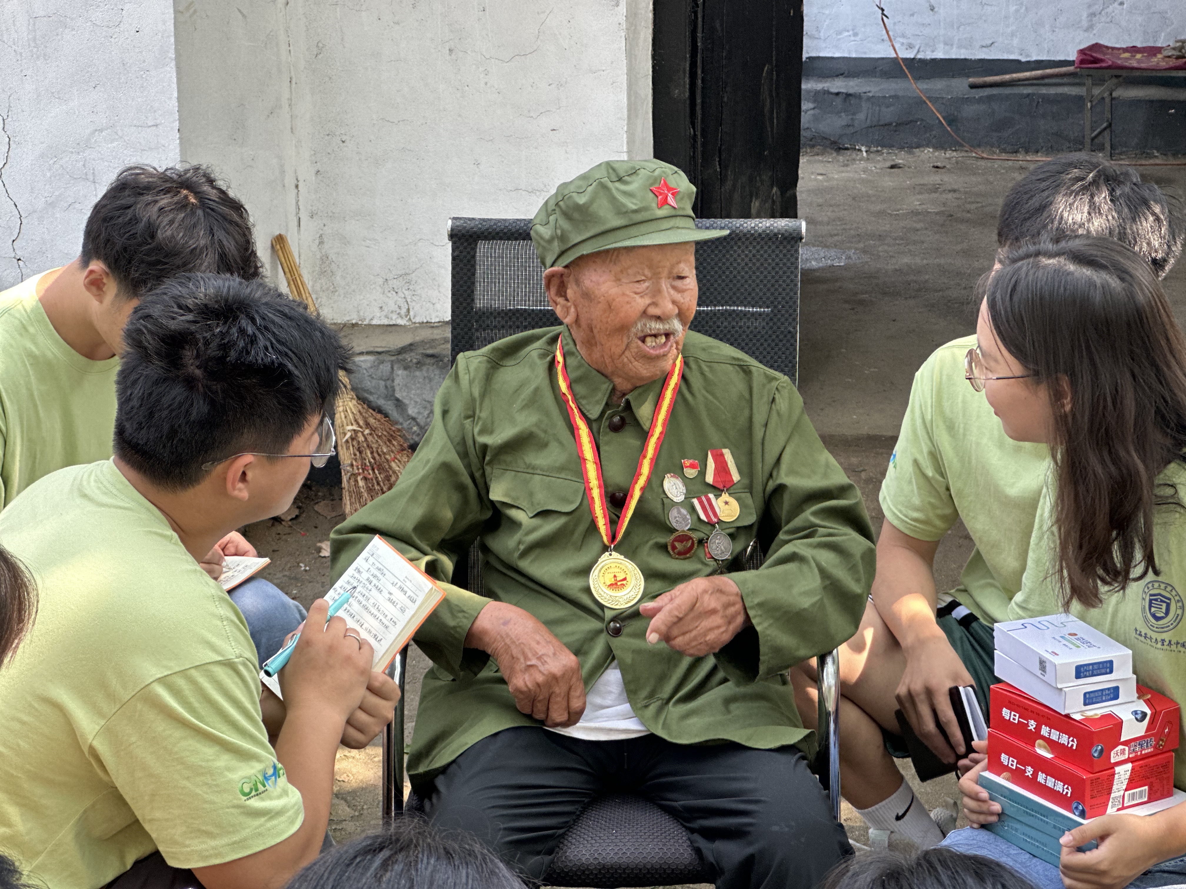 耄耋之年的王新太虽然身体欠佳、行动不便,但讲述自己当年的战争岁月,他仍是精神矍铄、记忆犹新。团队成员韩东元将学院新研发的特种食品赠送给爷爷。王新太感言现如今国家富足安康、科技进步发展,他眼含热泪,鼓励大家一定要努力学习,以入党为荣,以爱国为荣。