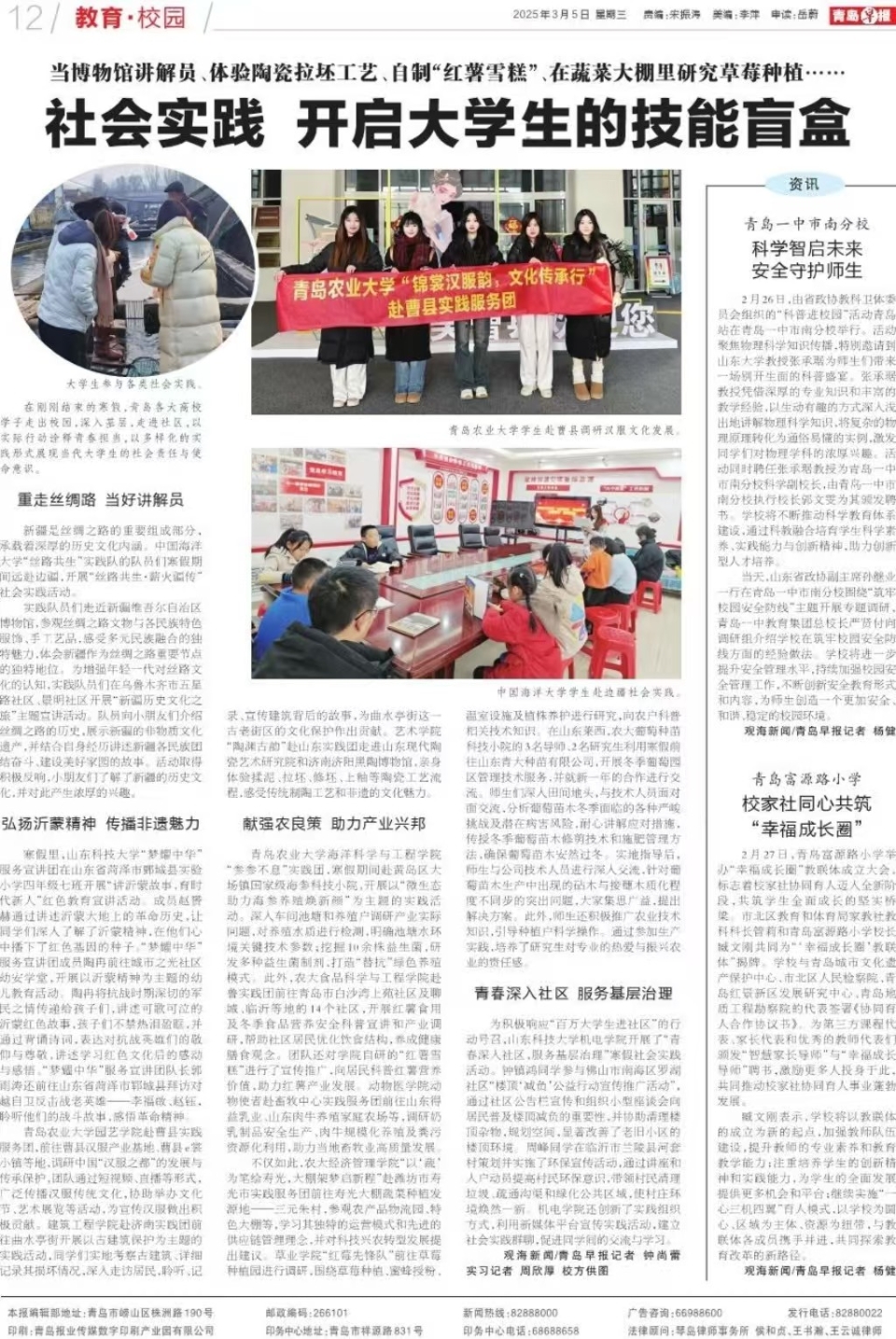 在刚刚结束的寒假,青岛各大高校学子走出校园,深入基层,走进社区,以实际行动诠释青春担当,以多样化的实践形式展现当代大学生的社会责任与使命意识。
