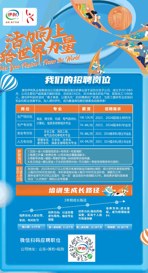 单位介绍:潍坊伊利乳业有限责任公司是伊利集团液态奶事业部下设的全资子公司,成立于2010年5月,公司主要生产超高温灭菌奶项目,总投资23亿元,共30条液态奶生产线。
