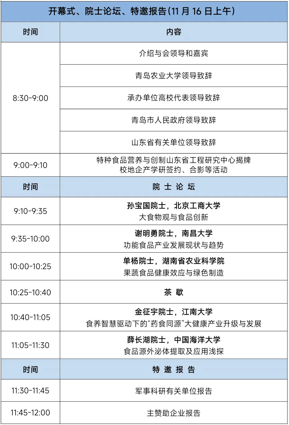 (三)协办单位(排名不分先后)特种食品创新创业共同体、农业农村部特种食品加工重点实验室(部省共建)、山东省特种食品技术创新中心、特种食品营养与创制山东省工程研究中心、山东省特种食品协同创新中心;国家稻米联盟米粉产业分联盟、山东省食品科学技术学会、山东省粮油学会、山东营养健康产业联盟、青岛市食品科学技术学会;山东农业大学太阳集团城娱8722、齐鲁工业大学太阳集团城娱8722、山东师范大学生命科学学院、山东理工大学农业工程与食品科学学院、鲁东大学食品工程学院、烟台大学生命科学学院、青岛大学生命科学学院、康复大学生命与健康学院、青岛滨海学院酒店管理学院等;逢时(青岛)海洋科技股份有限公司、山东民生集团有限公司、青岛诺安百特生物技术有限公司、青岛元达生物科技有限公司。