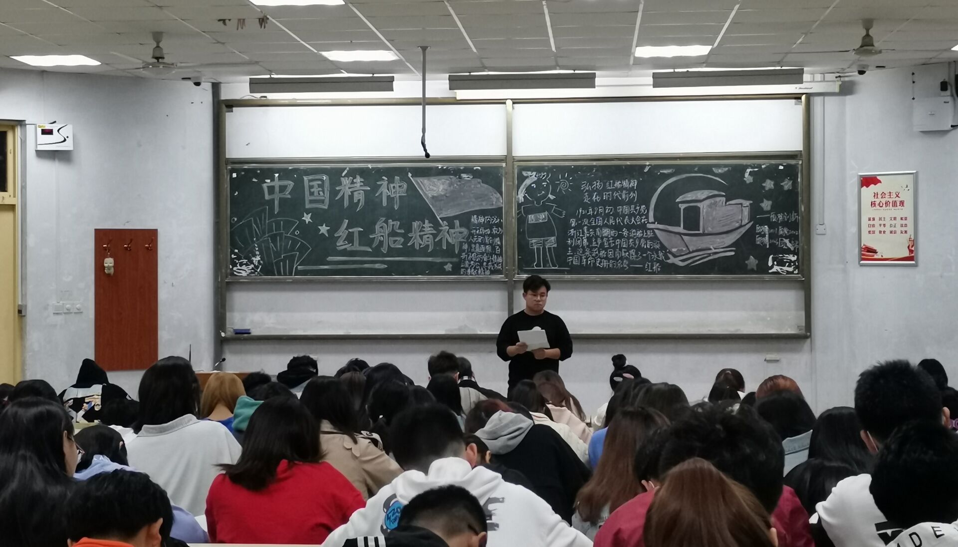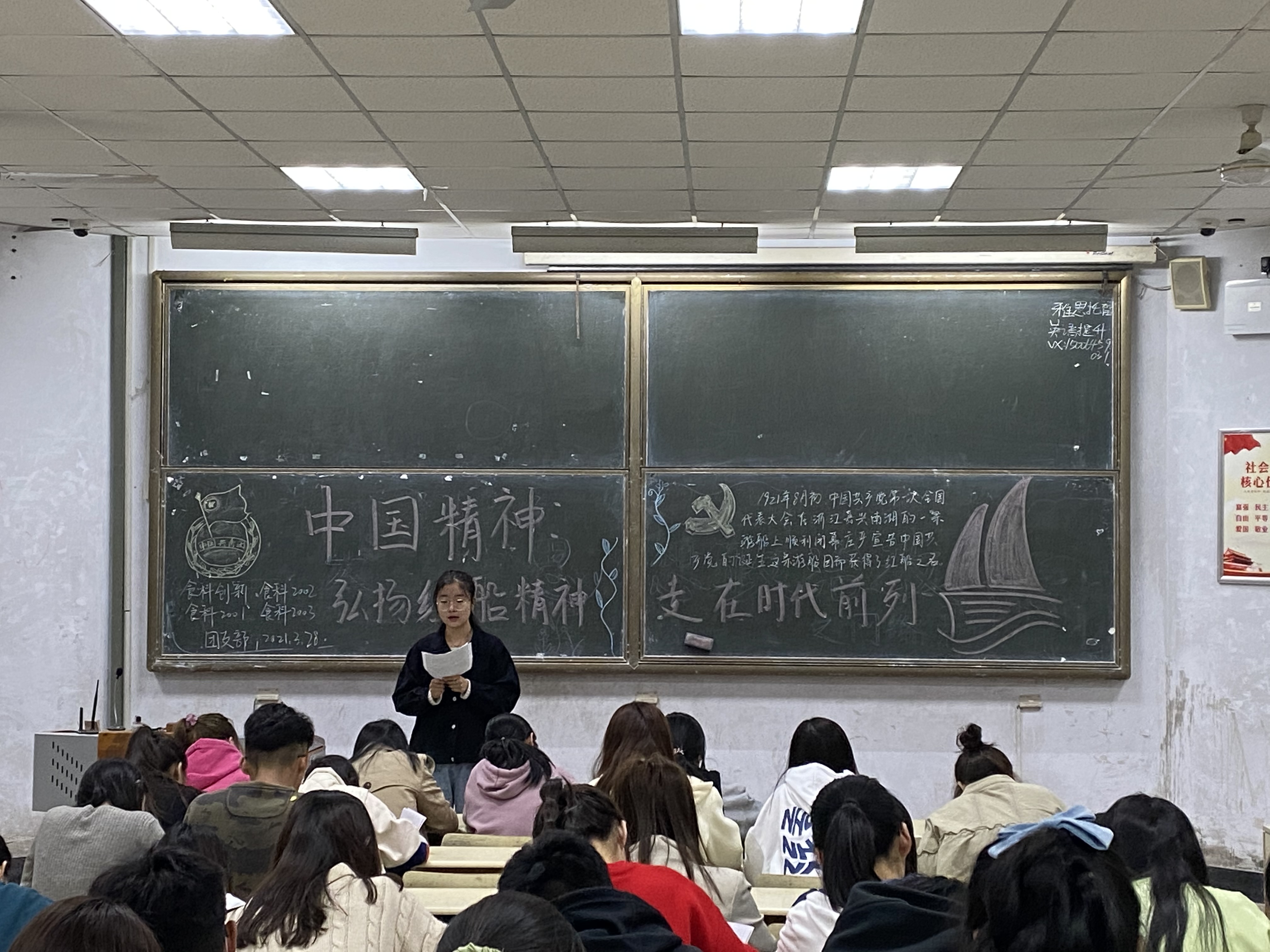 为响应国家号召,传承中国精神和红船精神,3月28日,太阳集团城娱8722在教学区开展“中国精神:弘扬红船精神,走在时代前列”主题政治学习。2019级,2020级同学积极参加。