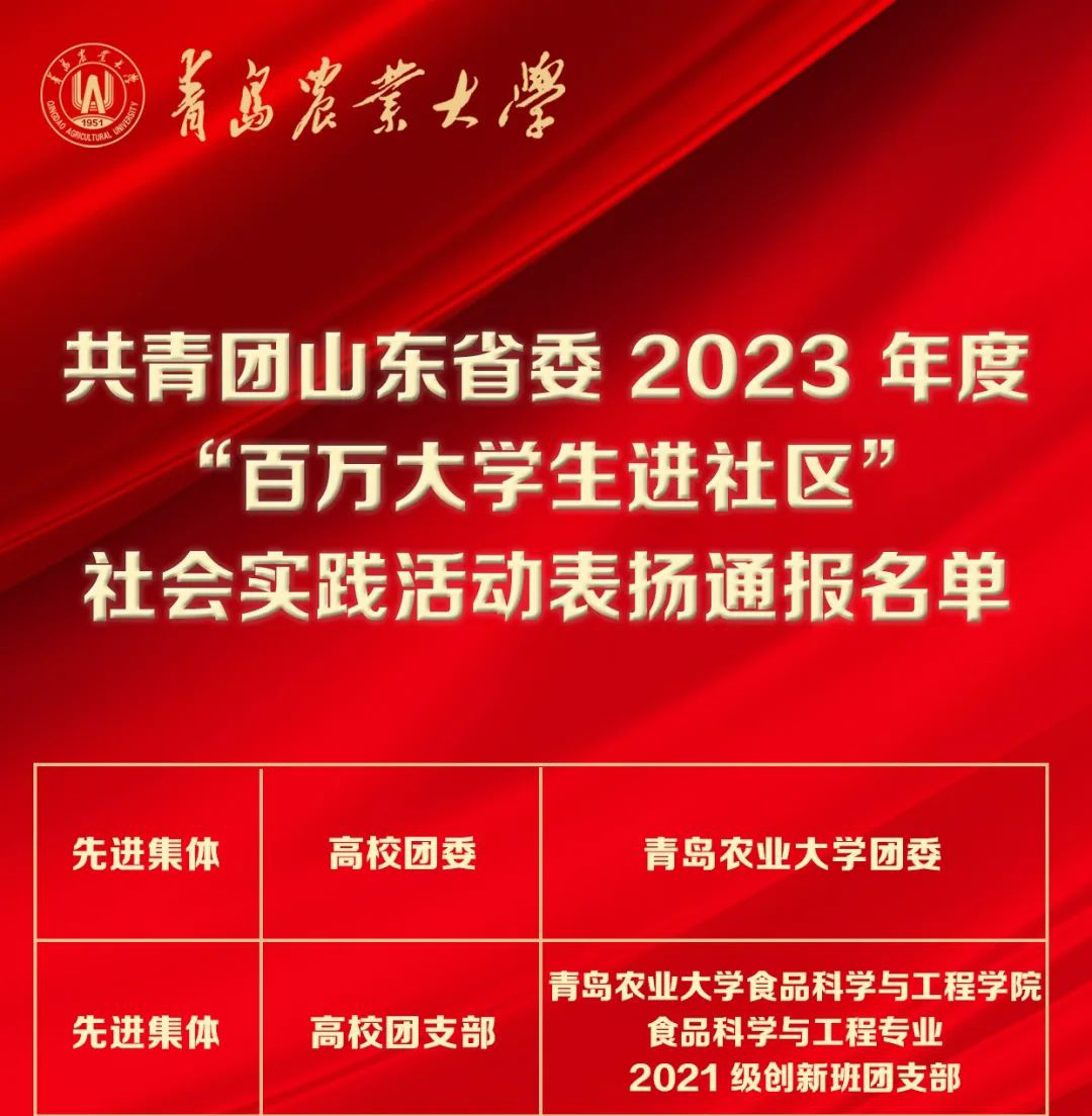 近日,在共青团山东省委发布的2023年度“百万大学生进社区”社会实践活动表扬通报名单中,我院食品科学与工程专业2021级创新班团支部获评社会实践先进团支部。
