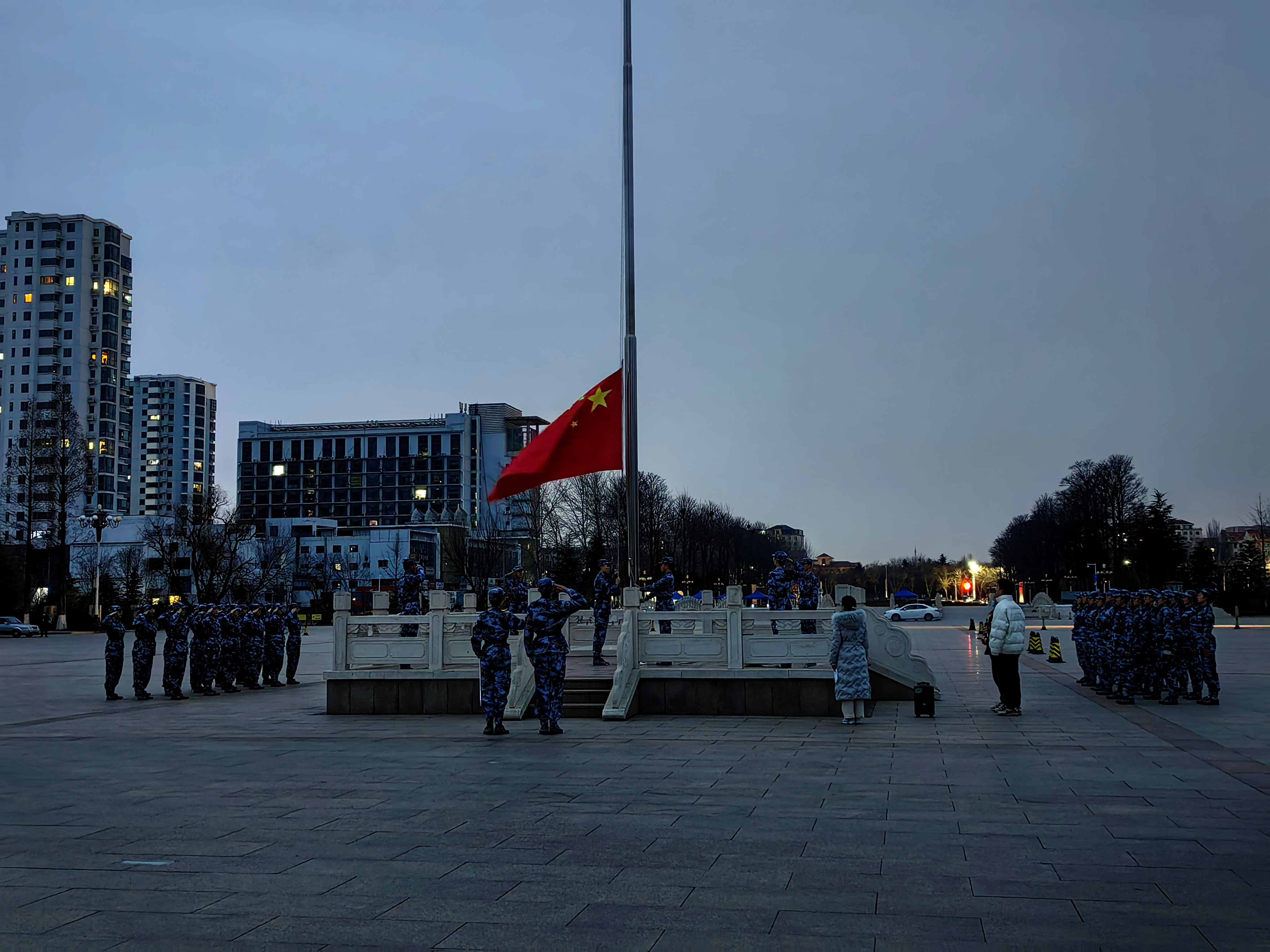 升旗仪式开始,国旗护卫队迈着整齐的步伐,护送鲜艳的五星红旗庄严入场。嘹亮的国歌声响彻云霄,大家整齐列阵,面向冉冉升起的五星红旗行注目礼。