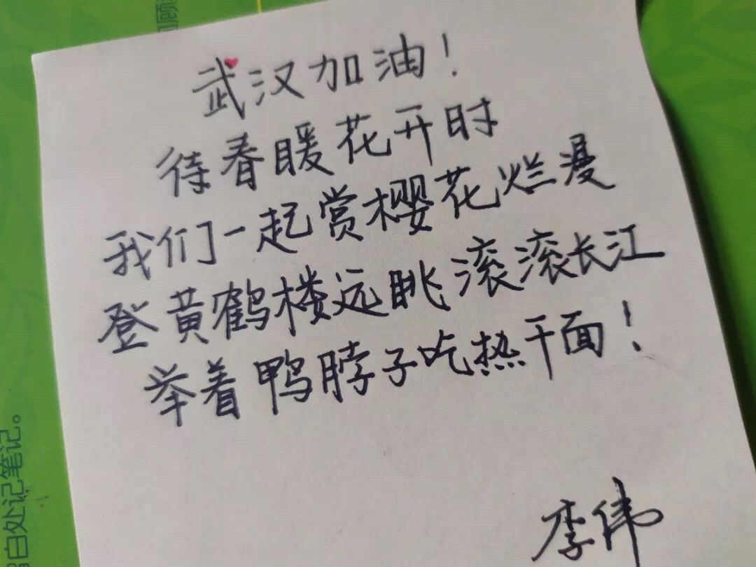 “你若无恙,我便安好”,在疫情当下,对很多人来说,“无恙”便是最大的期望。食品学子真情设计手写祝福,图文并茂,希望将自己的“无恙”期望传送到每一位此刻奋战在武汉的人。“武汉加油!待春暖花开时,我们一起赏樱花烂漫,登黄鹤楼远眺滚滚长江,举着鸭脖子吃热干面。”这是食品学子李伟满怀期待的祝福。“每个时代都有战士负重前行,为每一位战士祈福,你不是一个人在战斗,我们永远与你们同在”,一句话,透露出食品学子愿与白衣天使并肩作战的无畏精神。一线的医护人员舍己为人,不怕艰险,坚守在自己的岗位,食品学子也用自己独特的方式贡献自己的爱心,他们深感这个冬天不再寒冷,相信天佑中华,终将繁华与共。