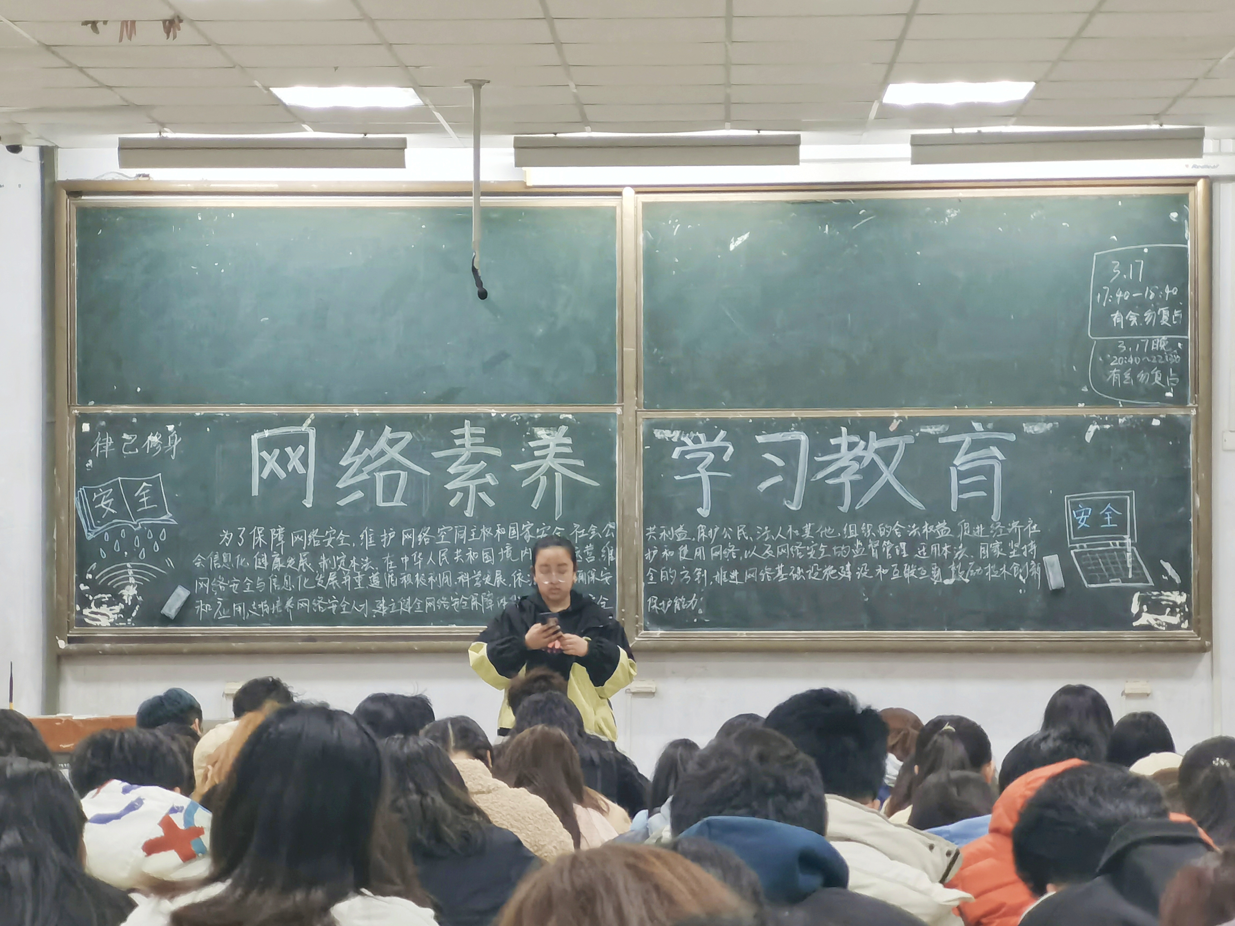 为响应国家号召,保障网络安全,提高大学生网络素养,3月21日,太阳集团城娱8722在教学区开展“网络素养学习教育”主题政治学习。2019级,2020级同学积极参加。