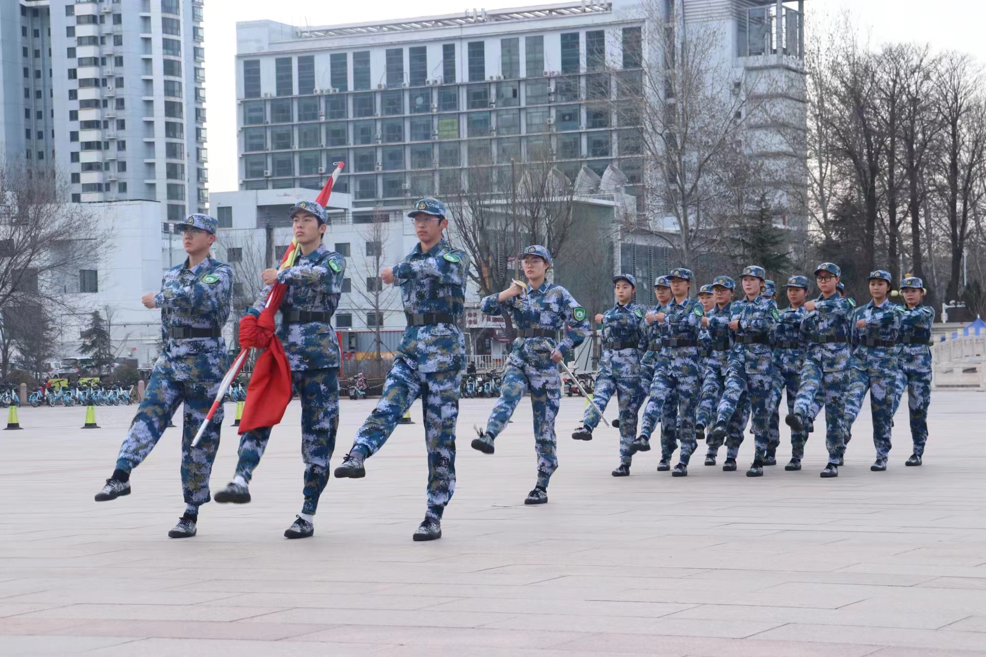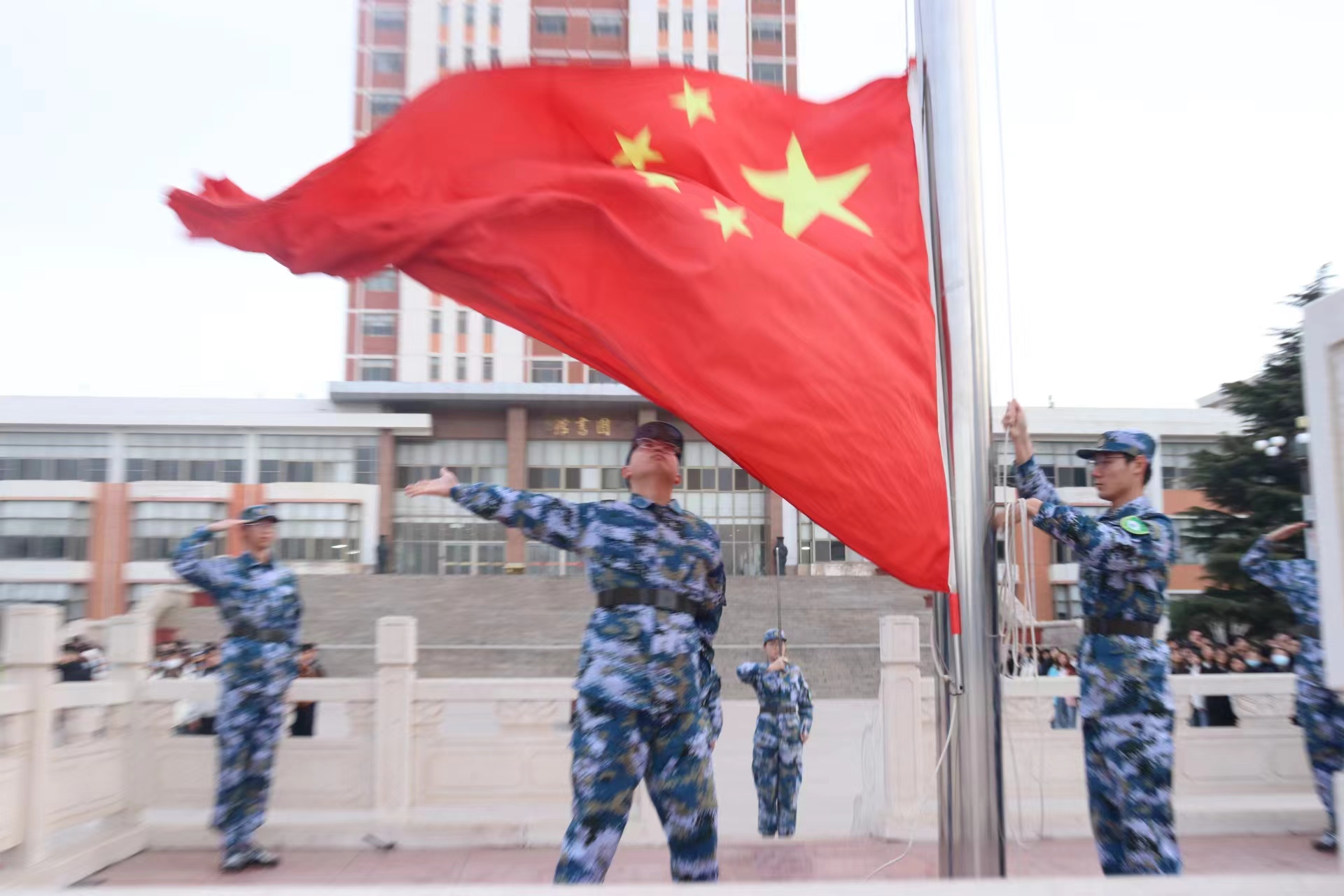 伴随春日的朝阳,学校国旗护卫队迈着铿锵有力的步伐,护送国旗入场。“升国旗,奏唱国歌”,师生肃立,伴随着激昂的义勇军进行曲,五星红旗在晨光中冉冉升起,全体师生庄严肃立,目光坚定,向着迎风飘扬的国旗致以最崇高的敬意。