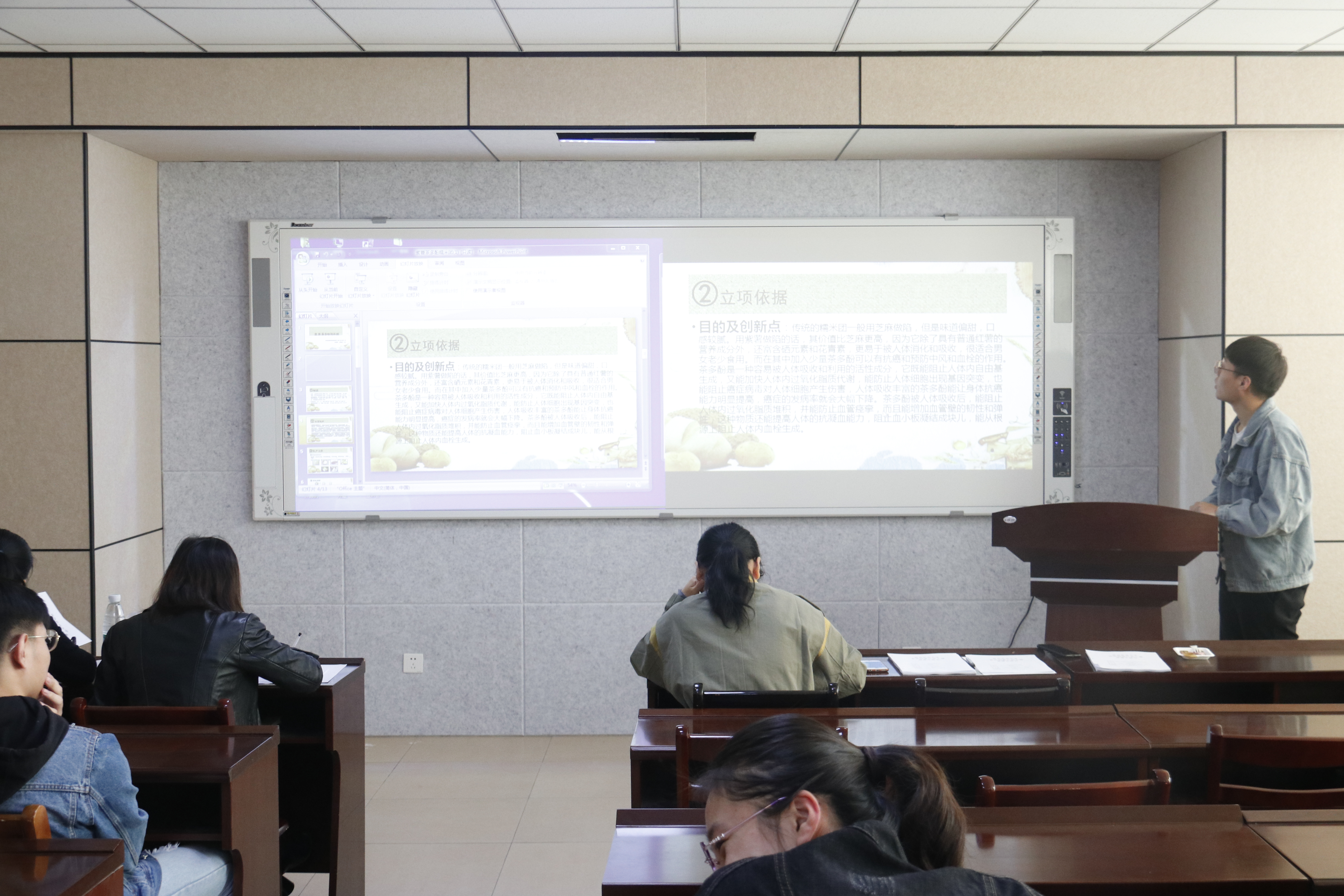 比赛分为创意团队PPT汇报和答辩两个过程。各团队需在五分钟内完成汇报,并接受教师对于创新项目的提问。其中“提取火龙果皮中的花青素制备抗氧化薄膜”主讲人从项目背景、生产工艺、产品描述、前景分析四个方面进行介绍。答辩老师对火龙果制作氧化膜变色问题提出疑问,并且建议将薄膜进一步做成可食性食品,挖掘更大潜能。“水晶肉”以别出心裁的思路将材料广泛的肉和易于制作的糖结合起来打造特殊口感,且可根据过各种模型来改造形态以此来吸引消费者。“马铃薯面包的制作”和“紫甘蓝蔬菜纸的研发与制作”两个课题分别运用了二次发酵和淀粉糊化等特殊工艺进行加工,运用多次对比实验来找到配方原料的最佳比例。