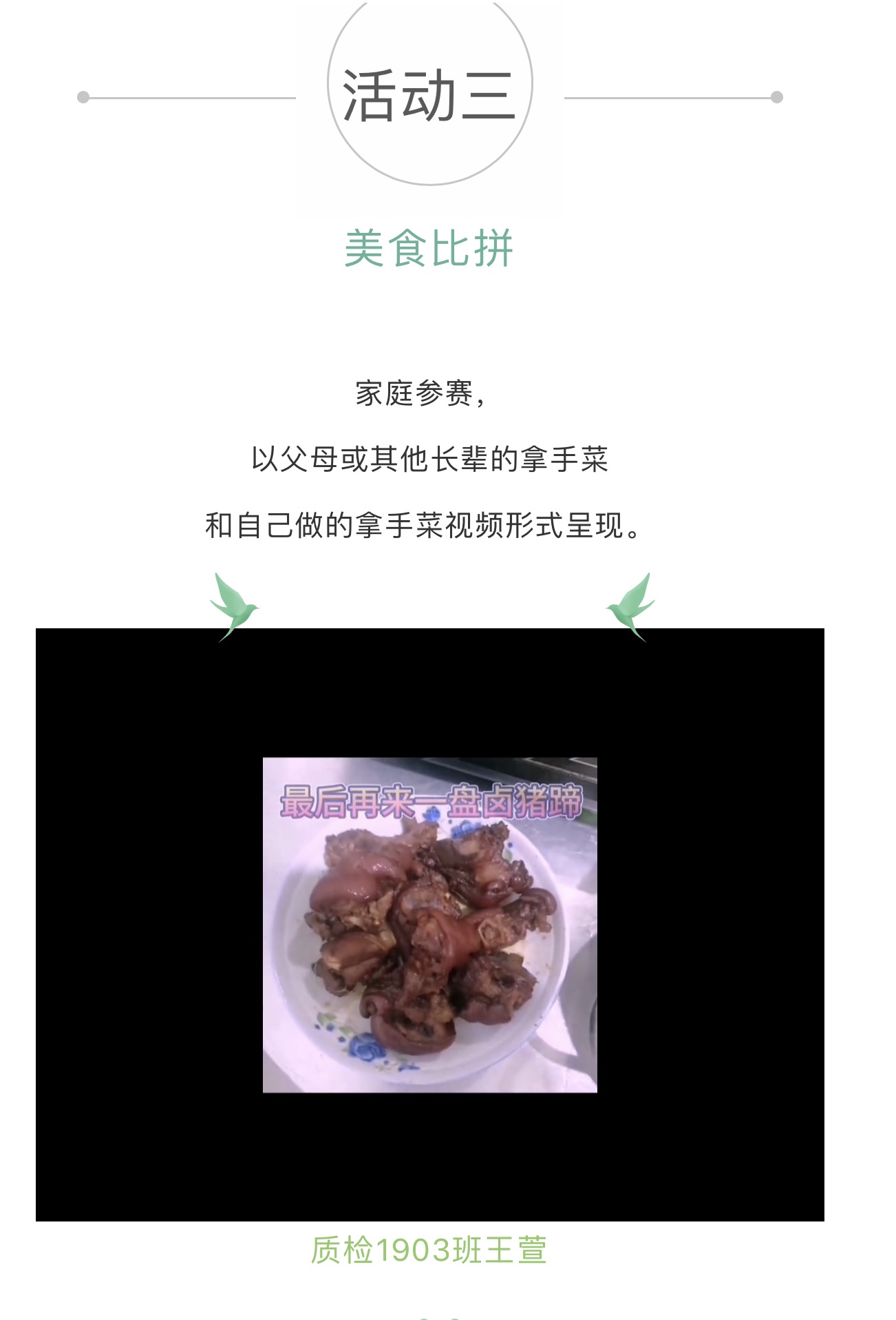 此次厨艺比拼大赛系列活动由3个单元组成,分别是:单人参赛自制美食篇、双人参赛地域美食互动篇和家庭参赛亲子美食比拼篇。大赛分前期作品准备、中期网络投票、后期统计评选三个阶段进行。在前期准备期间,各参赛同学迅速选定参赛内容,积极准备素材,通过照片或视频的形式,分享了的美食制作过程,呈现出了一道道精致美味的菜肴。其中质检1904班宋宏钰自制的焦糖奶茶有着原材料少,制作方便的优点,一解同学们对奶茶的“相思之苦”;食科1902班聂金苗制作的东北传统美食猪肉炖粉条看起来朴实,但在火候及选料上极为讲究,是省外同学对于家乡美食的喜爱与自信,与亲友围坐一桌,大快朵颐,便是生活的热烈与美好;质检1902班陆璀灿、崔盛柏两位同学参与地域美食互动,以辣子鸡和拔丝地瓜两式菜肴的照片展现了滕州及烟台两地的特色美食,色泽诱人的辣子鸡鲜香麻辣,拔丝地瓜牵丝不断,十分受孩子的喜爱。众多参赛作品玲琅满目,令人目不暇接,各式各样的美食使人感受到了中华美食的丰富多彩,体现了来自天南海北的食品学子的心灵手巧和他们充实而有意义的居家生活。