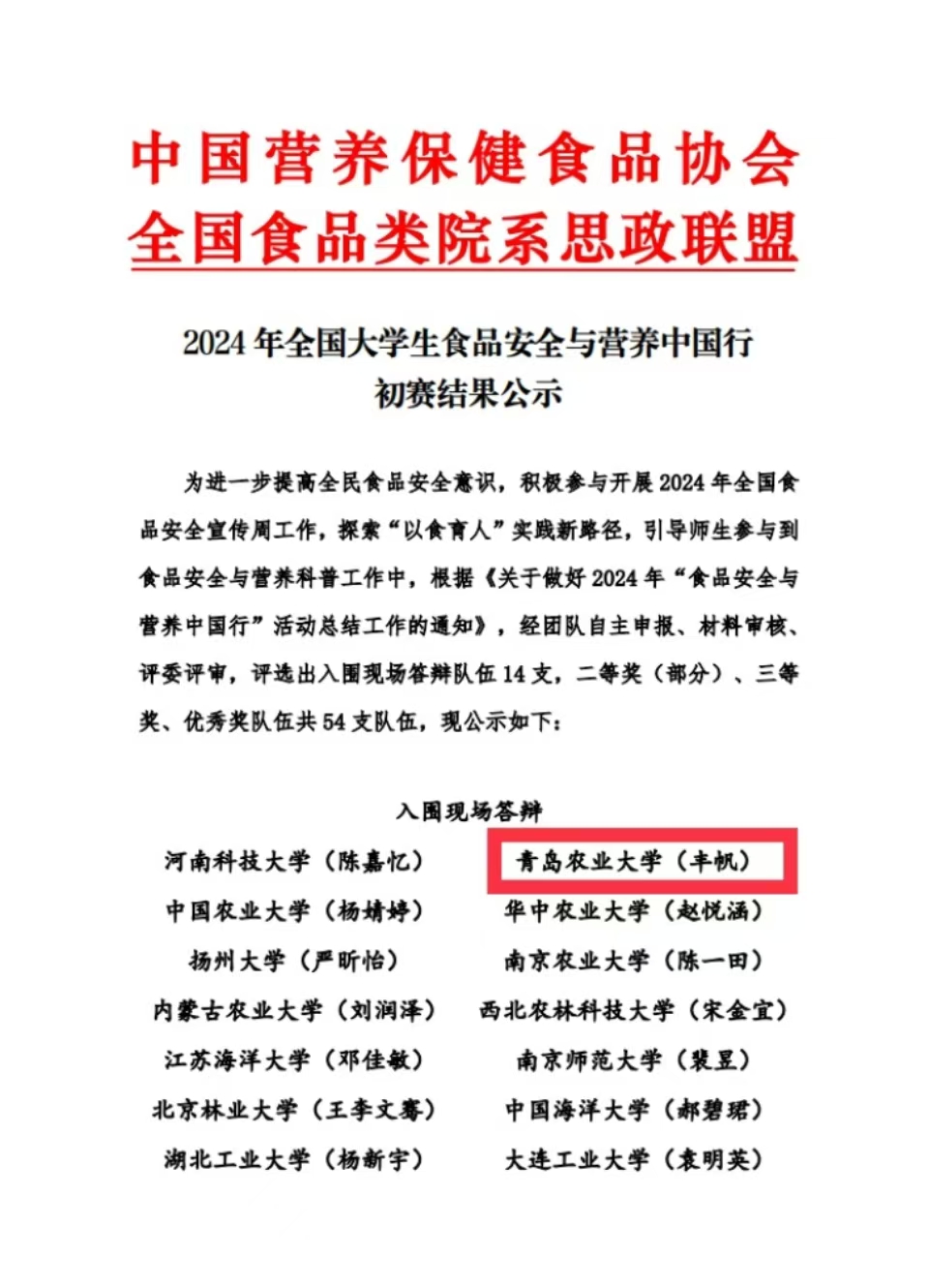近日,由全国食品类院系思政联盟举办的2024年全国大学生“食品安全与营养中国行”志愿服务大赛初赛结果名单公布,我院“美好‘食’光,安全相伴”志愿服务队以优异的表现成功从80余支队伍中脱颖而出,成功入围决赛,成为山东省唯一入围决赛现场答辩的高校。