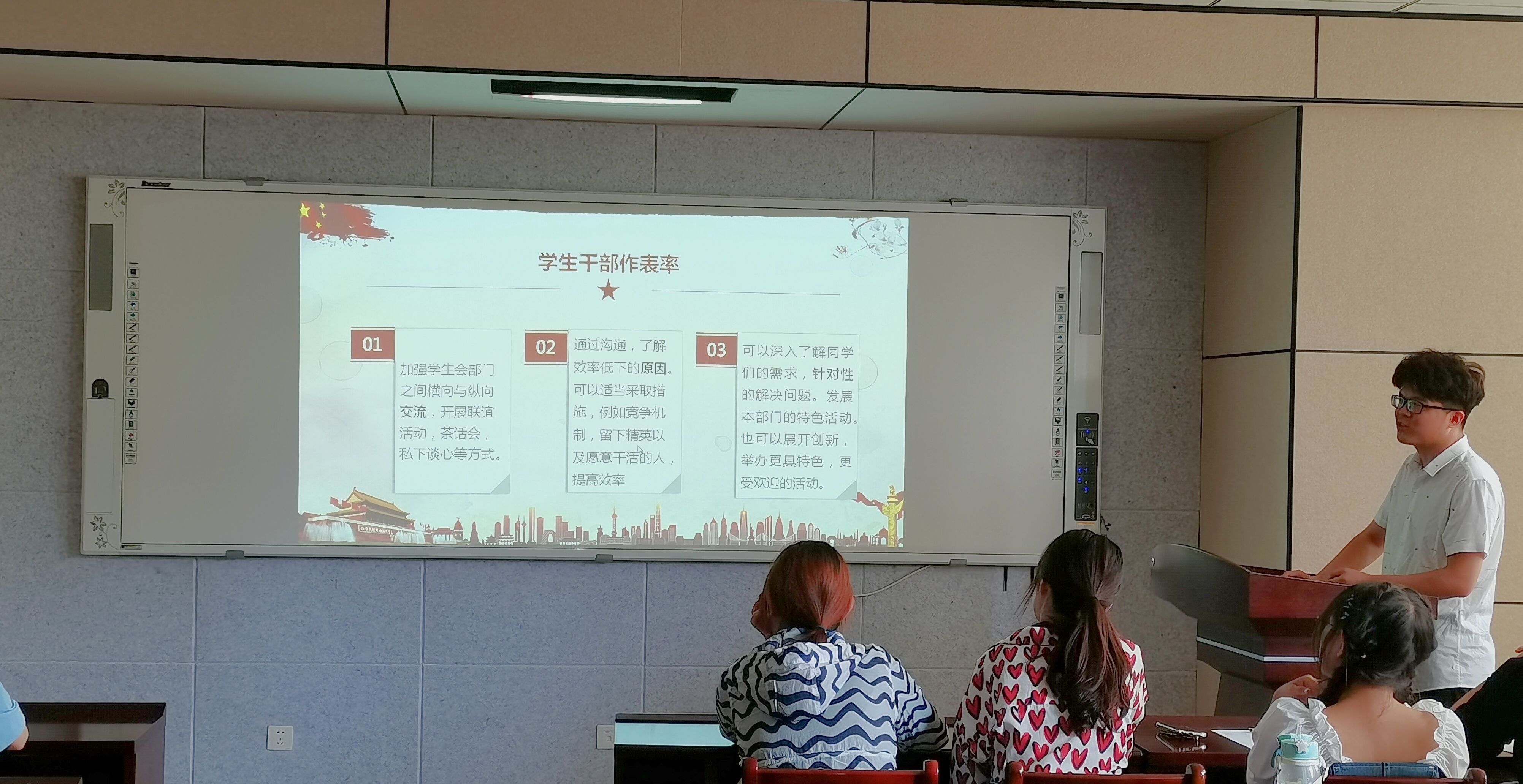 比赛通过抽签决定出场顺序,参赛选手按照顺序依次进行宣讲。每队制作一份关于共青团干部如何进行沟通与交流的PPT,并最终选出一人进行PPT宣讲。各组参赛队伍在宣讲过程中将满天星聚成一团火,集中展现出了团队的智慧。其中,食科2002班宋迎春以通俗的语言将组织比作企业,各团干部就好比企业的各个部门,只有交流好沟通好才能迸发出更大的效应。沟通的艺术是听与被听的艺术,葡萄2001班孙敏用倒金字塔形象地说明了沟通的重要性。