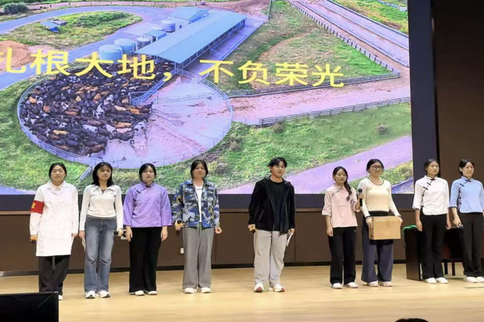比赛现场,各参赛队伍精神饱满、依次登台,以铿锵有力的朗诵直抒胸臆。选手们将炽热的爱国情怀融入字里行间,用声音描绘青春理想,用真情致敬峥嵘岁月。他们以青春之声穿越历史长廊,将对祖国的满腔热忱融入每一段旋律,生动展现了食品学子朝气蓬勃、奋发有为的精神气质。比赛环节结束后,我院学生自排自导自演的舞台剧《守鹅人》精彩上演。该剧以我校王宝维教授守护五龙鹅的真实事迹为蓝本,生动再现了科研工作者坚守初心、扎根大地的感人故事,赢得现场阵阵掌声。
