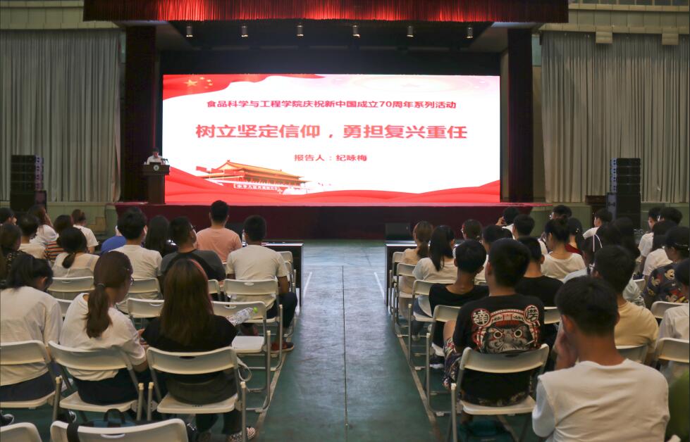 为庆祝中华人民共和国成立70周年,食品学院将开展主题报告会、合唱比赛、演讲比赛、社会调研参观等一系列活动,引导广大师生共抒爱国情怀、共扬民族精神、共话祖国新貌。本次报告会作为系列活动的开篇之作,是学院进一步加强大学生理想信念教育、爱国主义教育,培育和弘扬民族精神的一项探索。