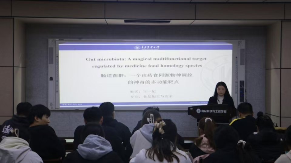 10月24日,食品学院举办第九期“食学研讲”活动,食品加工与安全专业24级研究生王一妃以“药食同源物种:肠道健康的新钥匙”为题作学术交流,报告揭示了肠道菌群与药食同源物种之间的紧密联系及其对人类健康的重要作用。