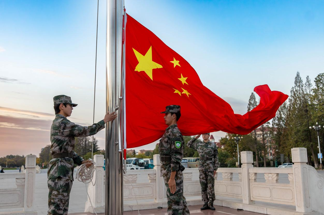 国旗护卫队迎着朝阳,以庄重而坚定的步伐护送着五星红旗走向升旗台。伴随着雄壮的国歌声响起,鲜艳的五星红旗冉冉升起,迎风飘扬。全体师生肃立注目,怀着无比崇敬的心情,目送国旗升至旗杆顶端。