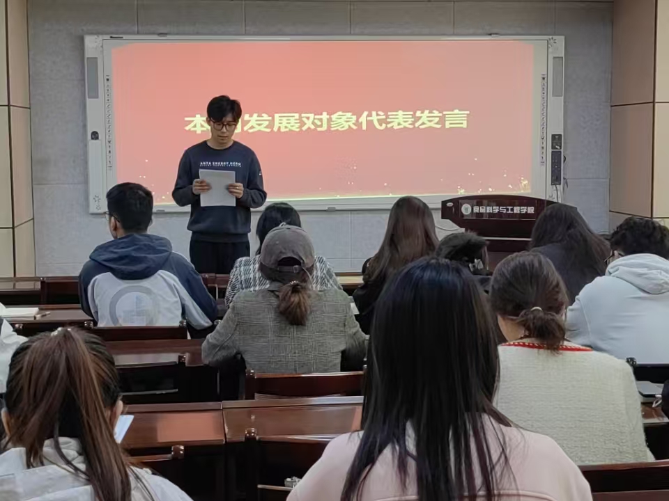 食品加工与安全22级研究生赵冠宇作为党员发展对象代表发言。他从提高政治站位,坚定理想信念;严明学习纪律,确保学有所获;加强实践锻炼,提升能力素质;树立良好形象,发挥表率作用四个方面表达了自己对加入党组织的渴望和决心。同时他代表全体党员发展对象承诺,将以更加严格的标准要求自己,努力学习党的理论知识,提升自身素质,积极参与各项实践活动,为早日成为一名合格的共产党员而不懈奋斗。