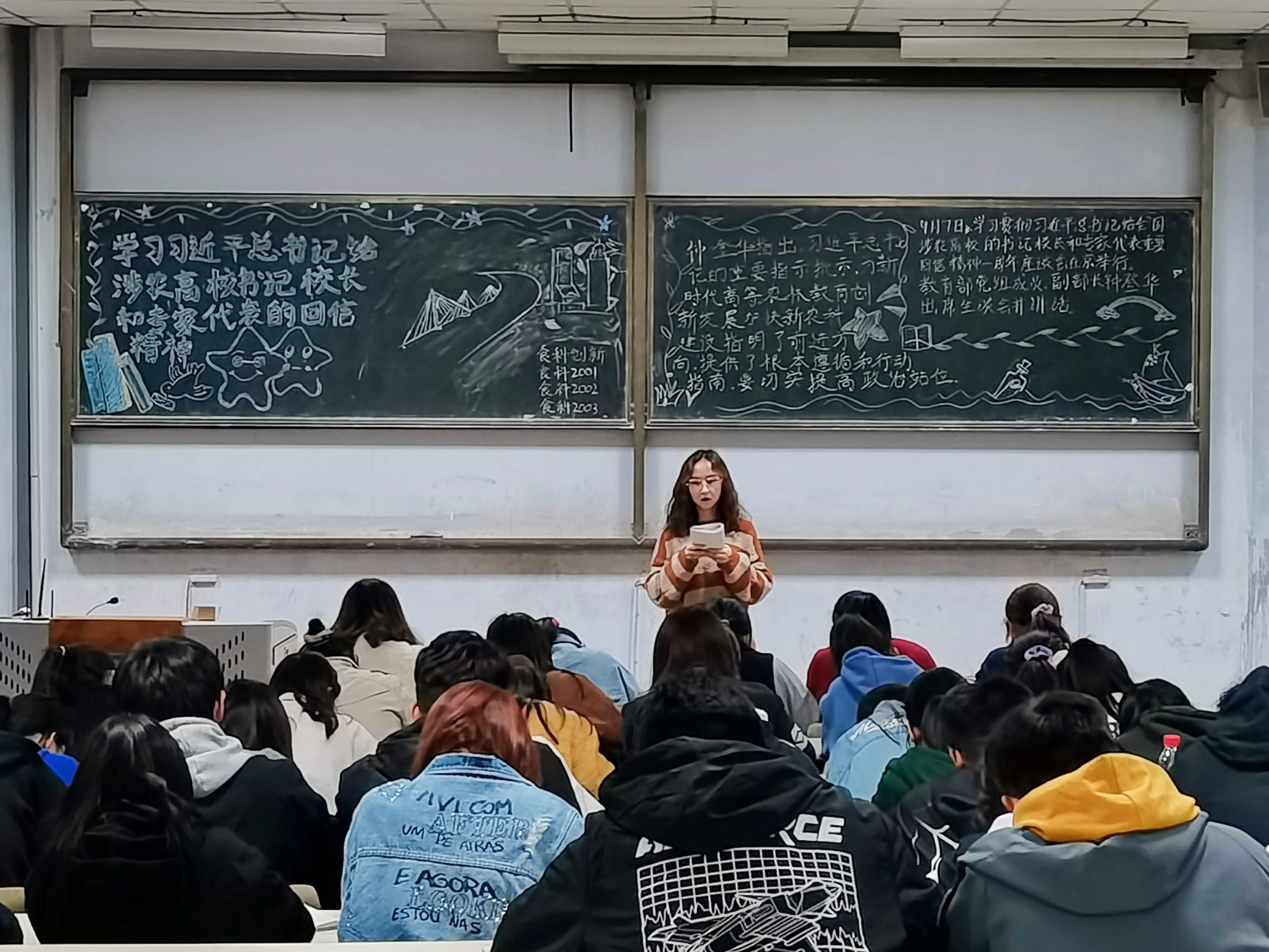 在本次政治学习过程中,各班主讲人对习近平总书记给全国涉农高校的书记校长和专家代表的回信进行讲解。质检2002主讲人代嘉琦概括了回信的主要内容。中共中央总书记、国家主席、中央军委主席习近平在信中指出:“中国现代化离不开农业农村现代化,农业农村现代化的关键在科技、在人才。”这句话体现了国家重视农学,发展农学和需要农学人才的迫切愿望。