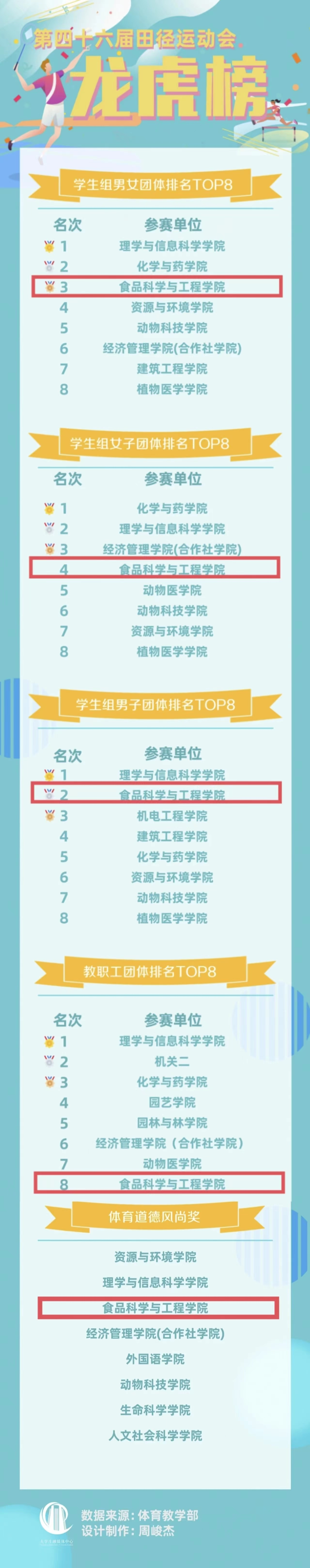 4月18日至19日,太阳集团网站8722第四十六届田径运动会举行,我院师生在各项赛事中团结奋进、拼搏争先、满载而归,最取得教工组团体第八名、男子组团体第二名、女子组团体第四名、总成绩第三名的优秀成绩,刷新学院全校田径运动会团体成绩的最好记录,学院同时获评体育道德风尚单位。