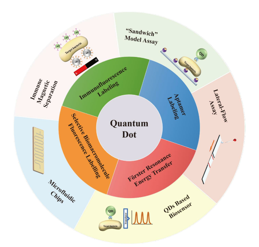 在该文章中,作者系统总结了量子点的类别、荧光标记方法(免疫、核酸适配体、特异性生物大分子、荧光共振能量转移、直接标记)以及构建量子点检测食源性致病菌的检测方法策略。同时对比了量子点检测方法与其他方法的优缺点,可见量子点检测方法具有检测便捷、灵敏度高、环境友好和适于实时分析等优点。利用量子点对食源性致病菌的高效标记和示踪,对食品生物污染防控和保障舌尖上的安全具有重要意义。