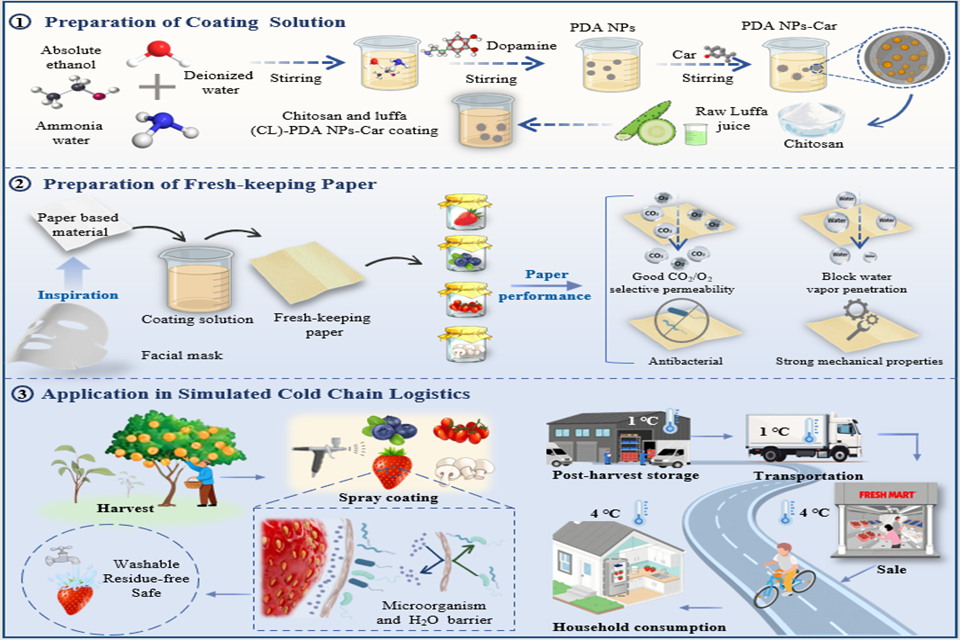 其中研究性文章受到面膜“保湿抗菌”功效的启发,首次提出并制备了一种集高效保湿和协同抗菌活性于一体的纳米复合保鲜纸,旨在延缓水果和蔬菜采后质量的恶化。该研究以可降解纸为基材,通过负载纳米复合涂层(CL-Car PDA NP)构建了具有双重保湿抗菌功能的保鲜纸(P-Car-PDA NP),并系统研究了CL-Car PDA NP和P-Car-PDA NP的理化性质和保鲜效果。当Car与PDA NP的体积比为1:15(v/v)时,PDA NP的最大装载效率达到63.90%;在模拟的冷链物流条件下,CL-Car PDA NP和P-Car-PDA NP都能有效延缓Car的释放,并对黑曲霉表现出优异的抑制活性。同时,CL Car PDA NP还展现出卓越的物理阻隔性能、可清洗性和生物安全性:用CL-Car PDA NP处理的小鼠单核巨噬细胞,细胞存活率高达94.56%,且与空白对照组相比,绿豆芽的发芽率和平均株高均无显著差异,证实了其良好的生物安全性。在此基础上,以可降解纸为基材构建的P-Car-PDA NP保鲜纸,其机械性能、水蒸气阻隔性能(WVP)及气体选择性均较对照组显著提升:在模拟冷链物流下储存6天后,抗拉强度提高520%,WVP降低60.60%。同时,在四种食品模拟物中,P-Car-PDA NP的总迁移量均低于10 mg/dm²的监管阈值,符合安全使用要求。在模拟冷链物流条件下,P-Car-PDA NP可将草莓、蓝莓、樱桃番茄和双孢蘑菇的保质期分别延长至第8天、第18天、第25天和第10天,其保鲜效果优于单独的CL-Car PDA NP。硕士研究生张琳为该论文第一作者,鞠健为通讯作者。