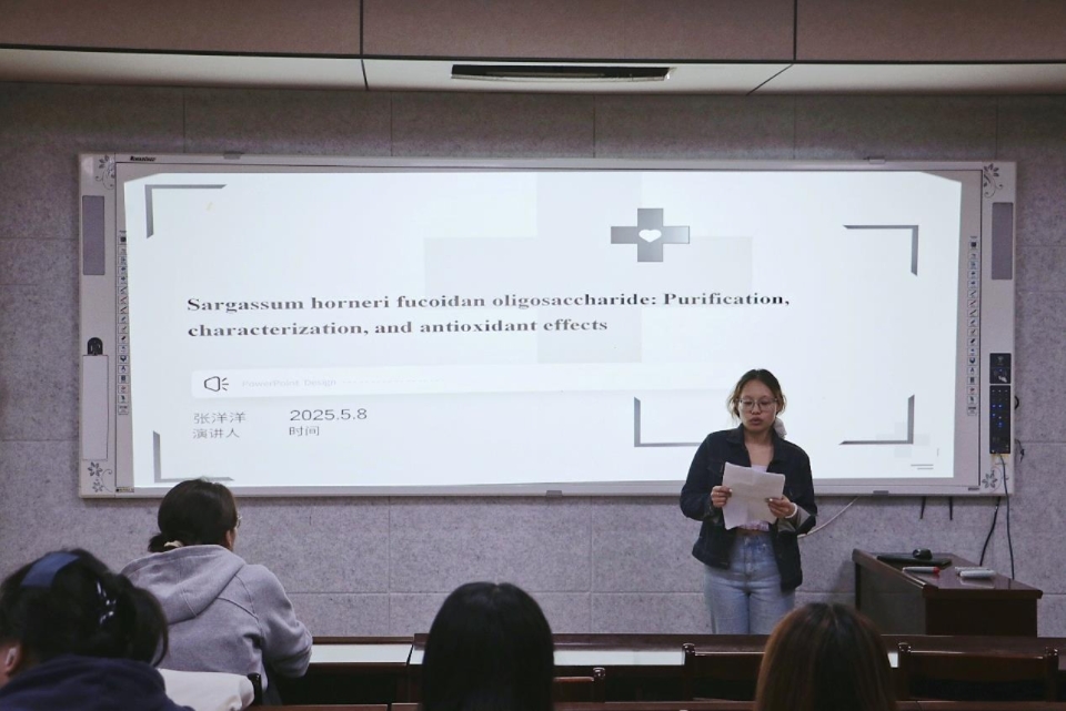 5月8日,食品学院在食品楼302举办第四十四期“食学研讲”活动。本次活动由食品加工与安全专业2024级研究生张洋洋担任主讲,主题为“马尾藻角质岩藻多糖寡糖:纯化、表征和抗氧化作用”。