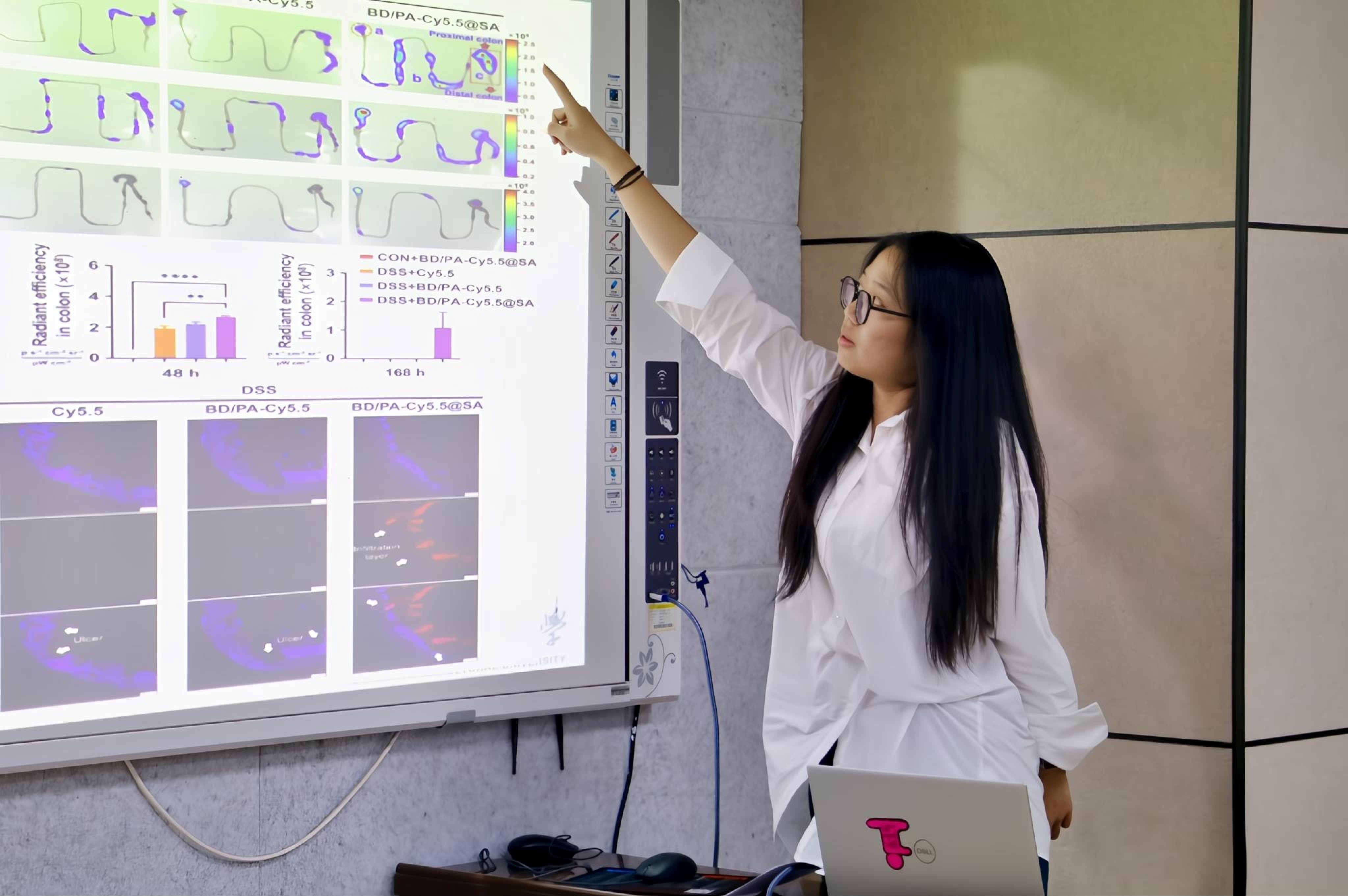 体内外实验表明,BD/PA@SA能显著缓解DSS诱导的小鼠结肠炎症状,促进黏膜修复,调控肠道菌群失衡,并提升短链脂肪酸(SCFAs)水平。闫家文讲到,文章的研究不仅为溃疡性结肠炎提供了一种新型口服治疗策略,也为中药现代化与多功能递药系统的设计提供了新思路。