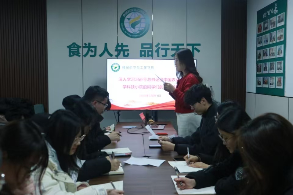 学生代表张一帆、黄禹溪领学《习近平给中国农业大学科技小院的同学们的回信》,阐述对习近平总书记所言“自讨苦吃”的理解,立志要志存高远、脚踏实地,把课堂学习和乡村实践紧密结合,厚植爱农情怀,练就兴农本领。