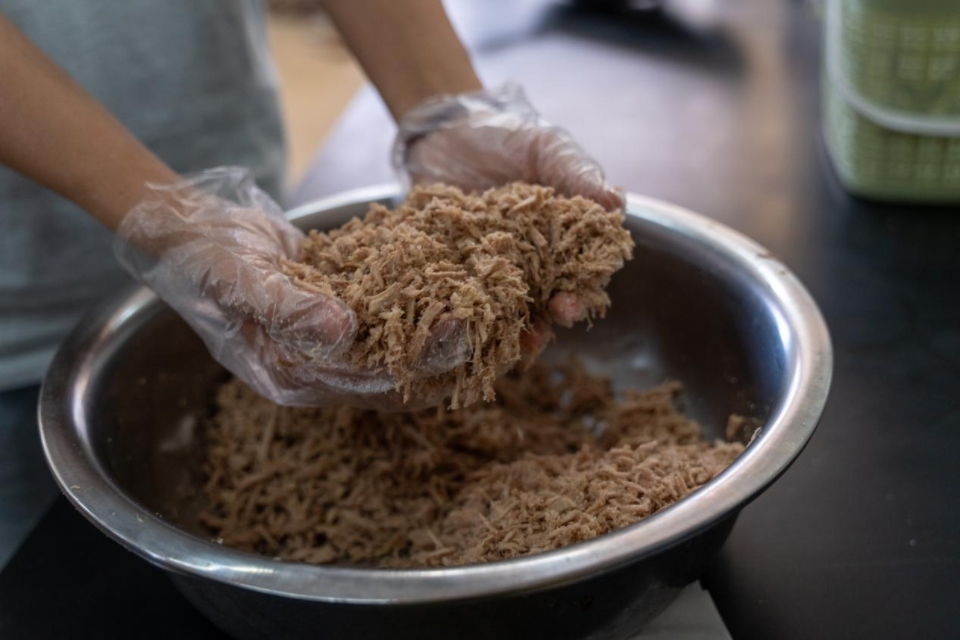 讲解结束后,各小组回到操作区开始动手制作。同学们分工明确,有条不紊地进行撕丝、翻炒等工序,现场气氛热烈而专注。经过大家的共同努力,一份份香气四溢的肉松新鲜出炉。活动接近尾声,参与者围坐在一起,分享劳动心得与感悟。