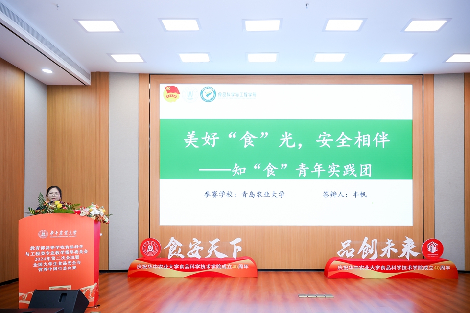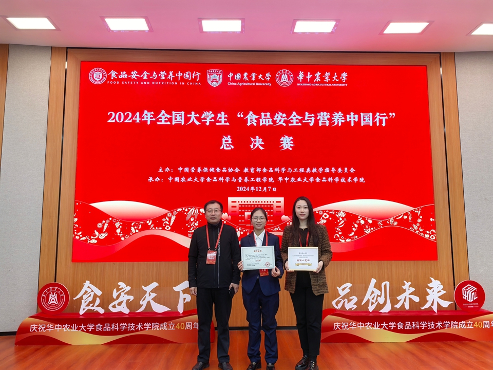 12月7日,由中国营养保健食品协会、教育部食品科学与工程类教学指导委员会指导的2024年全国大学生“食品安全与营养中国行”志愿服务项目总决赛在华中农业大学举行,食品学院“美好‘食’光,安全相伴”志愿服务队与来自全国13所高校的实践团队共同进行了答辩交流,经专家评审,学院团队获二等奖,团队负责人丰帆获最佳人气奖。