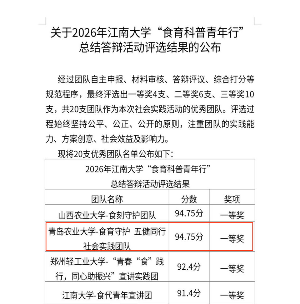 4月1日,由教育部高等学校食品科学与工程类专业教学指导委员会指导的2026年“食品强国梦青年行”全国社会实践活动落下帷幕,食品学院两支团队与来自全国30所高校的实践团队共同进行了答辩交流,经专家评审,学院两支团队均获一等奖。