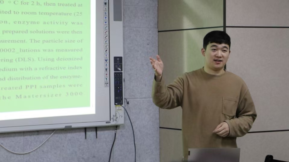 12月19日,食品学院举办了第三十六期“食学研讲”学术汇报活动。本次活动由食品加工与安全专业24级研究生王君豪主讲,他以“转谷氨酰胺转胺酶和漆酶对豌豆蛋白凝胶性质的影响与大豆蛋白的比较”为主题,探讨了植物蛋白凝胶性能的改进研究,吸引了众多师生参与。