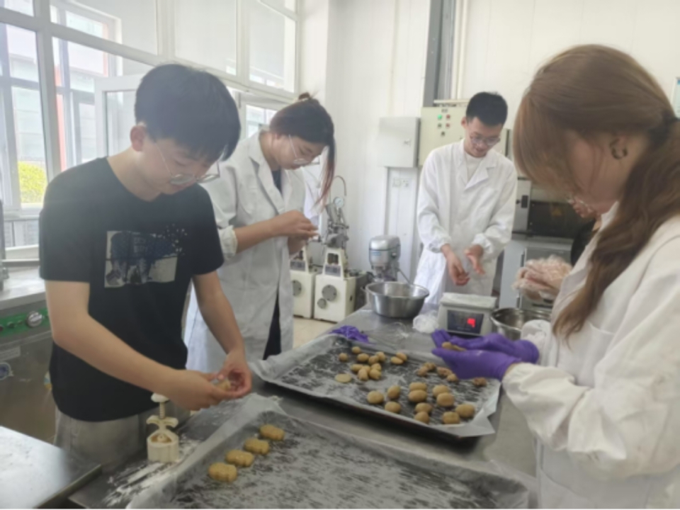 在烘焙实践活动中,同学们始终保持着饱满的热情与浓厚的兴趣,依次完成和面、塑形、烘烤等制作工序。实验室里,老师全程驻守指导,结合过往成功经验与失败案例进行分阶段讲解——从面团软硬程度的把控技巧,到模具按压时的力度要点,再到烤箱温度与烘烤时长的科学配比,帮助同学们系统掌握饼干制作的全流程工艺。